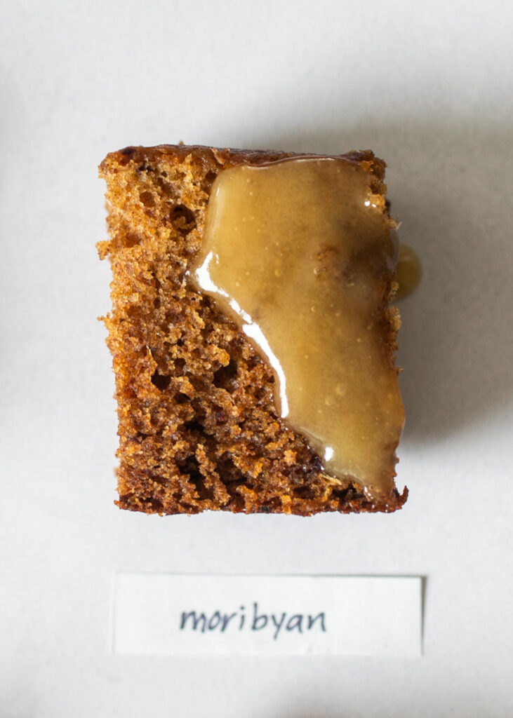 Moribyan: A soft, slightly bland cake with a vanilla-forward caramel sauce