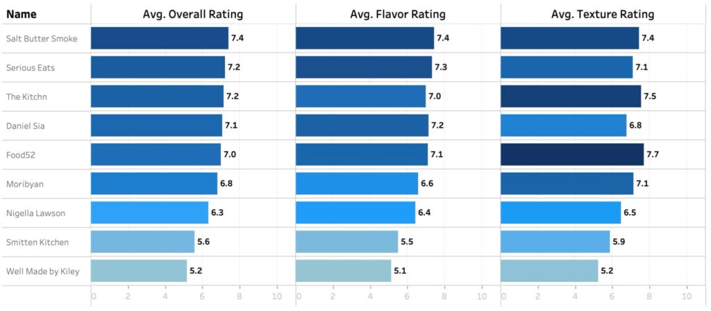 There was also significant baker’s error that occurred with Smitten Kitchen, so although I am including the scores in the table for transparency, this recipe should be taken out of the running to be fair. As for Well Made by Kiley–this was actually one of my favorite recipes, but you can read more in the analysis section on why some tasters didn’t agree.