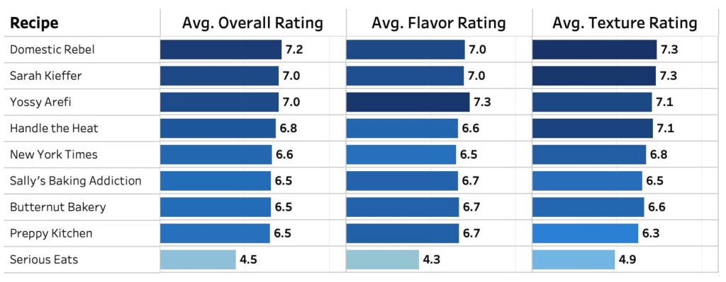 This was another interesting bake off with lots of the final scores clustered together. After summarizing the ratings from all 61 (!! the highest amount of tasters ever, I think) tasters, you can see that Domestic Rebel took first place with an average overall rating of 7.2. However, Sarah Kieffer was close behind with a 7.0 rating (and you can see that with rounding, her average flavor/texture ratings look identical to Domestic Rebel).