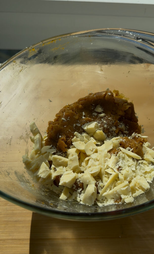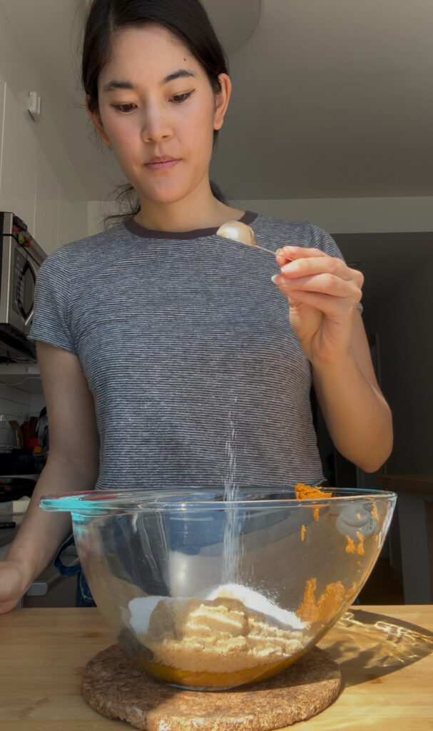 - Transfer the pumpkin mixture to a separate bowl–this will help the dough cool so it doesn't melt the chocolate later on. Add 1/2 cup granulated sugar and 1/4 cup brown sugar and stir until fully combined. Stir in 1/4 tsp baking soda and 1/4 tsp kosher salt until combined, then fold in 3/4 cup all-purpose flour until just a few streaks remain.