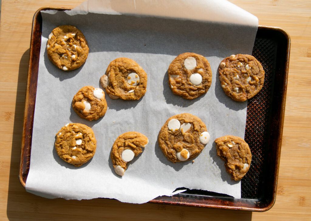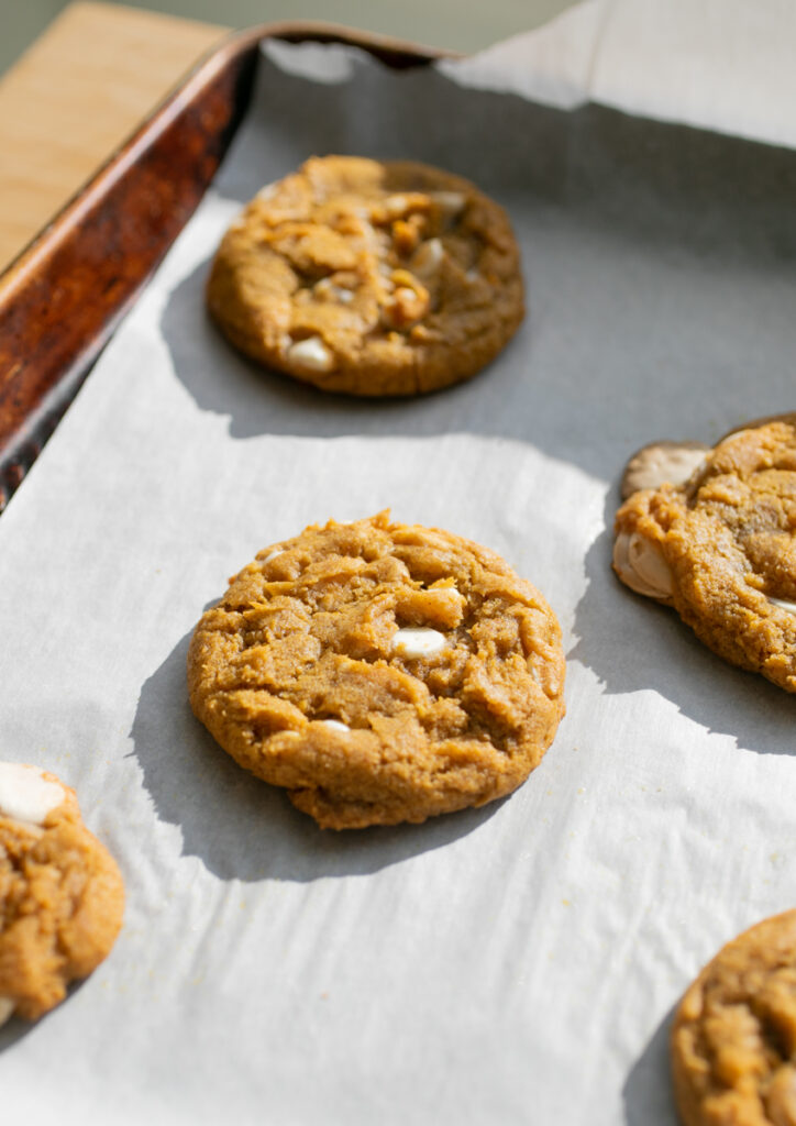 I did attempt these several times with finely chopped macadamia nuts, but ultimately found I preferred these with just white chocolate. I did also test a batch with olive oil (the four cookies on the right side of the baking sheet in the below photo), but really disliked the flavor.