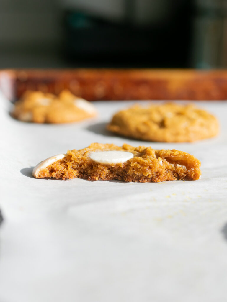 I love pumpkin cookies–so much that I did a pumpkin cookie bake off where I baked 9 different pumpkin cookie recipes in one day in search of the best. While I loved many of the recipes in the bake off, I was in the mood for a type of cookie those 9 recipes didn’t offer–a slightly flatter but still chewy, medium thick cookie that was bursting with pumpkin flavor. So I set out to adapt some of my favorite recipes to achieve my ideal cookie!