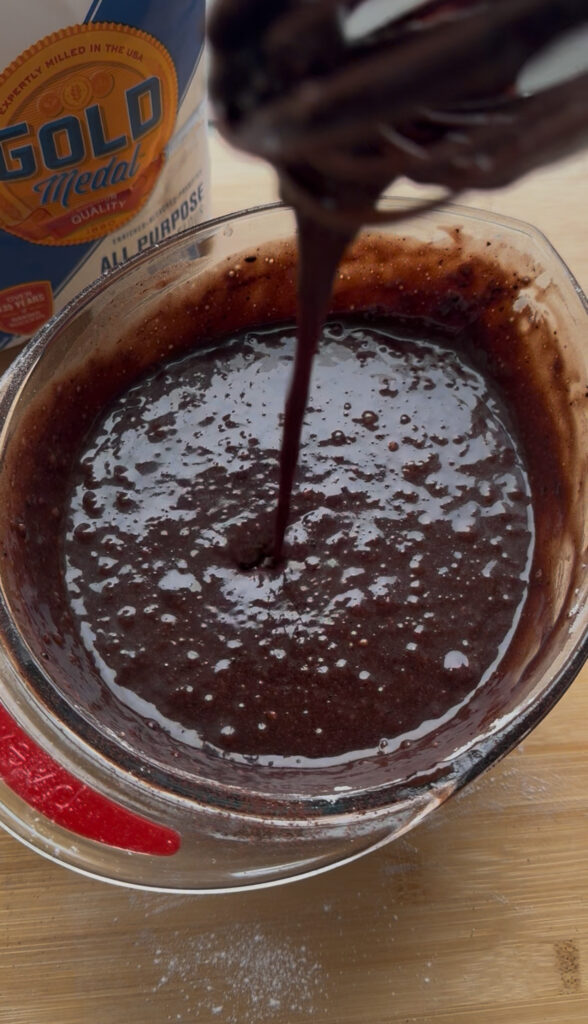 - Sprinkle the baking soda, baking powder and salt over the mixture and whisk in until fully combined. Whisk in the cocoa until fully combined, then whisk in the flour until no streaks remain.
