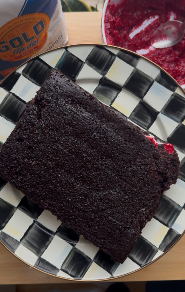 Step 3: Pour batter into a half sheet pan (13×18″) lined with parchment and bake at 350 for 20-24 minutes.
