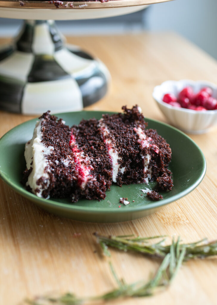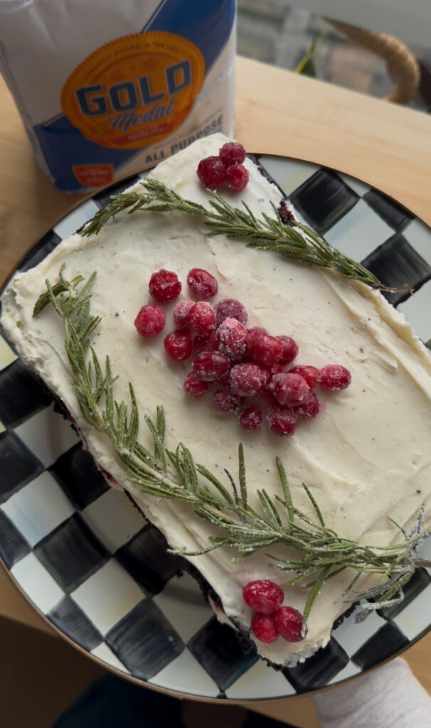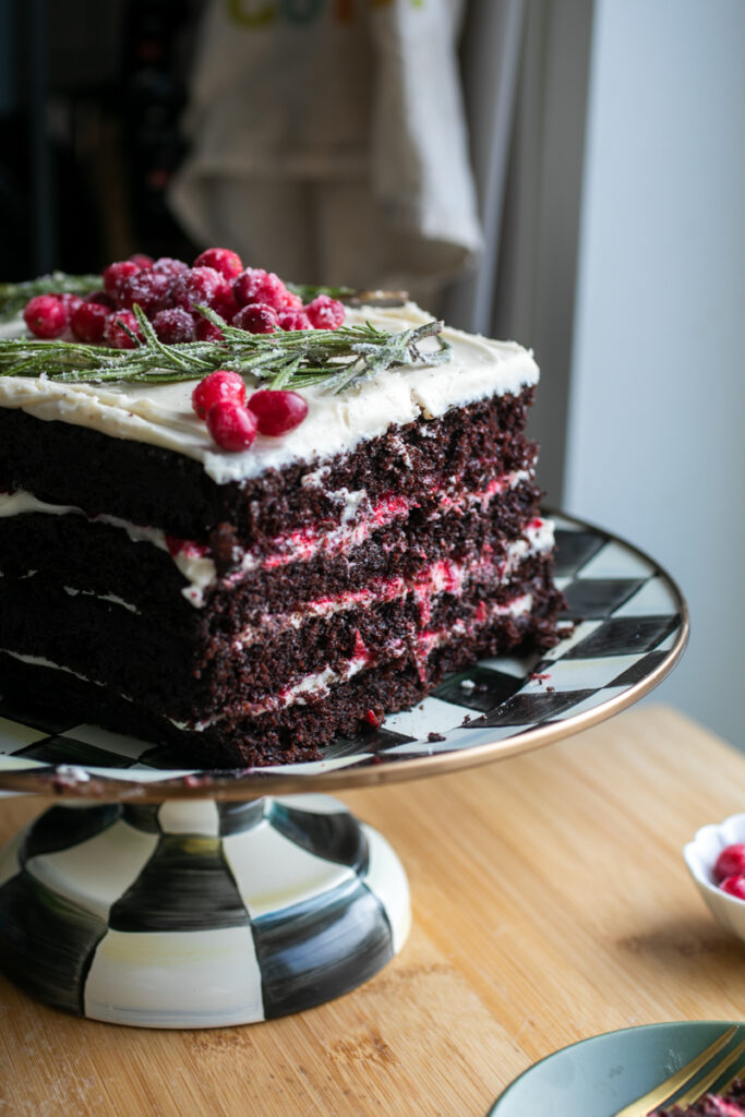 - Cut the chilled cake into fourths. Place one rectangle of cake on a cake stand and top with 1/4 of the frosting, then 1/3 of the cranberry compote. Repeat with the remaining cake layers, frosting and compote, ending with a layer of frosting. Top with sugared cranberries and rosemary, if desired.