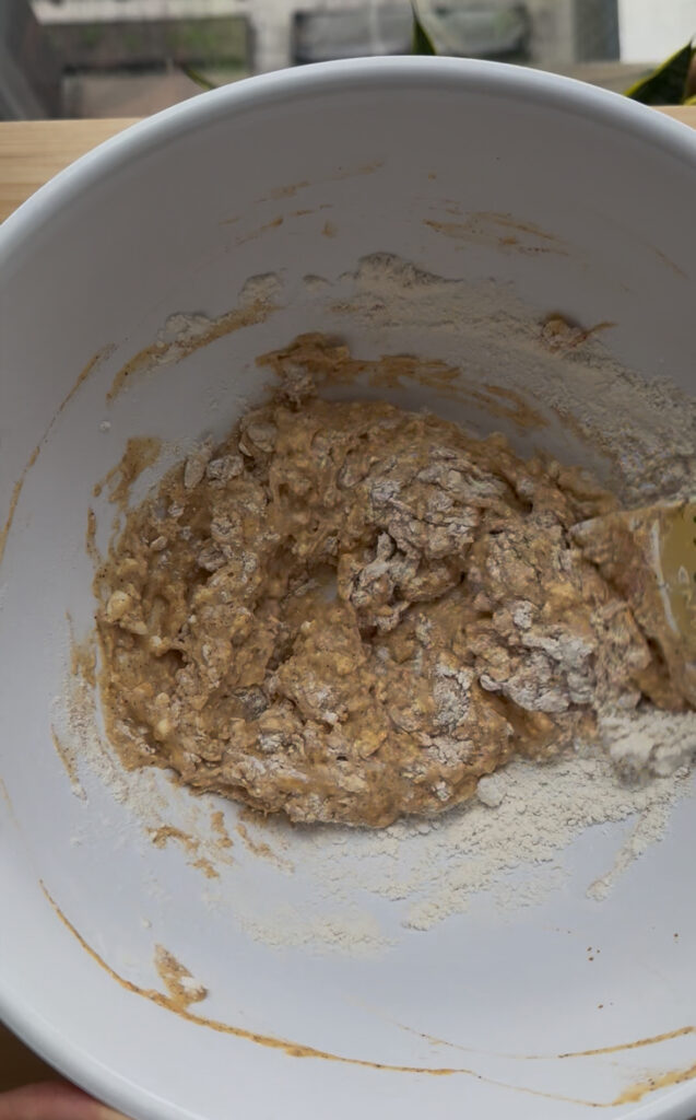 - Sprinkle over the sugar or syrup, spices, baking powder and salt and stir to combine evenly. Lastly, stir in the flour until you have a very thick batter.
