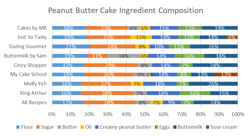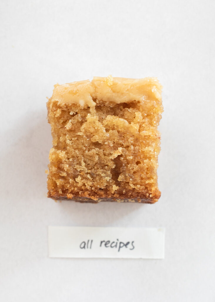 To me, Just So Tasty is an interesting study against Daring Gourmet’s recipe. They’re similar (both are oil-based with brown sugar and similar ratios), but Just So Tasty uses milk instead of buttermilk. JST has a slightly higher ratio of oil and peanut butter, but a slightly lower ratio of flour and dairy. Most importantly, JST uses processed peanut butter while Daring Gourmet calls for natural. JST is also the only recipe that called for a bit of cream cheese in the frosting rather than straight peanut butter buttercream.