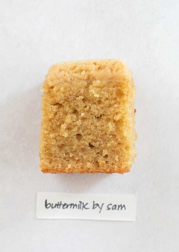 Ultimately, my suspicions were realized–I think the higher ratio of egg lent the cake almost too much structure and firmness from the protein and coagulation properties of the egg. It had one of my least favorite springy, slightly firm textures. And after calculating the ratios of all the recipes, I realized that Buttermilk by Sam has a nearly identical egg ratio (around 16%). I also didn’t prefer the firmer crumb texture of this cake and I suspect eggs are the culprit.