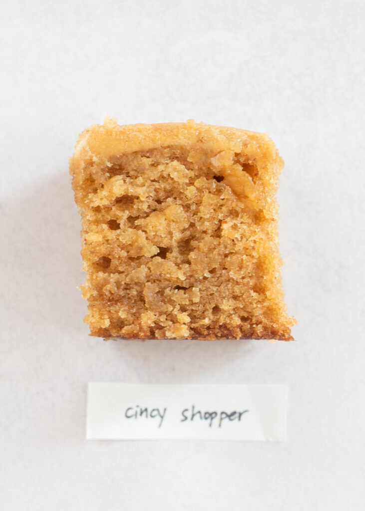 But the top two rated CAKES (Just So Tasty and Molly Yeh) use oil alone to achieve a cake that’s moist and plush. Interestingly, Cincy Shopper’s butter-based cake reached a respectable 5th place while King Arthur (the only other butter-based cake) landed towards the bottom. This discrepancy is probably due to other factors–i.e. King Arthur’s high egg ratio which likely caused a firmer crumb vs. Cincy Shopper’s high sugar/liquid ratio which helped keep it moist.