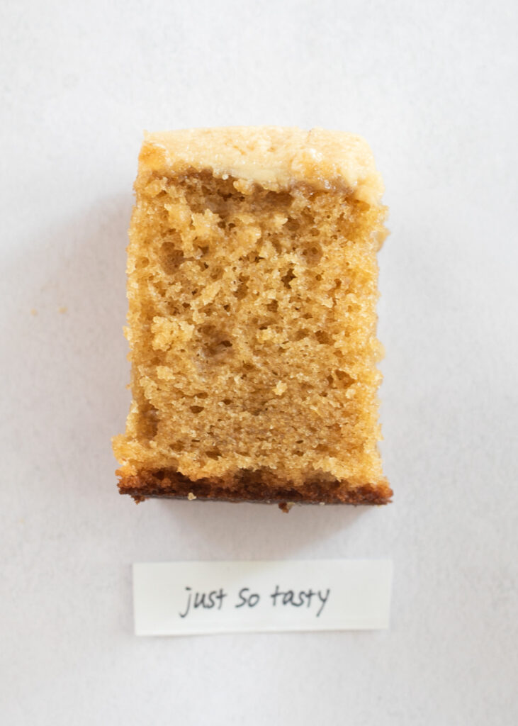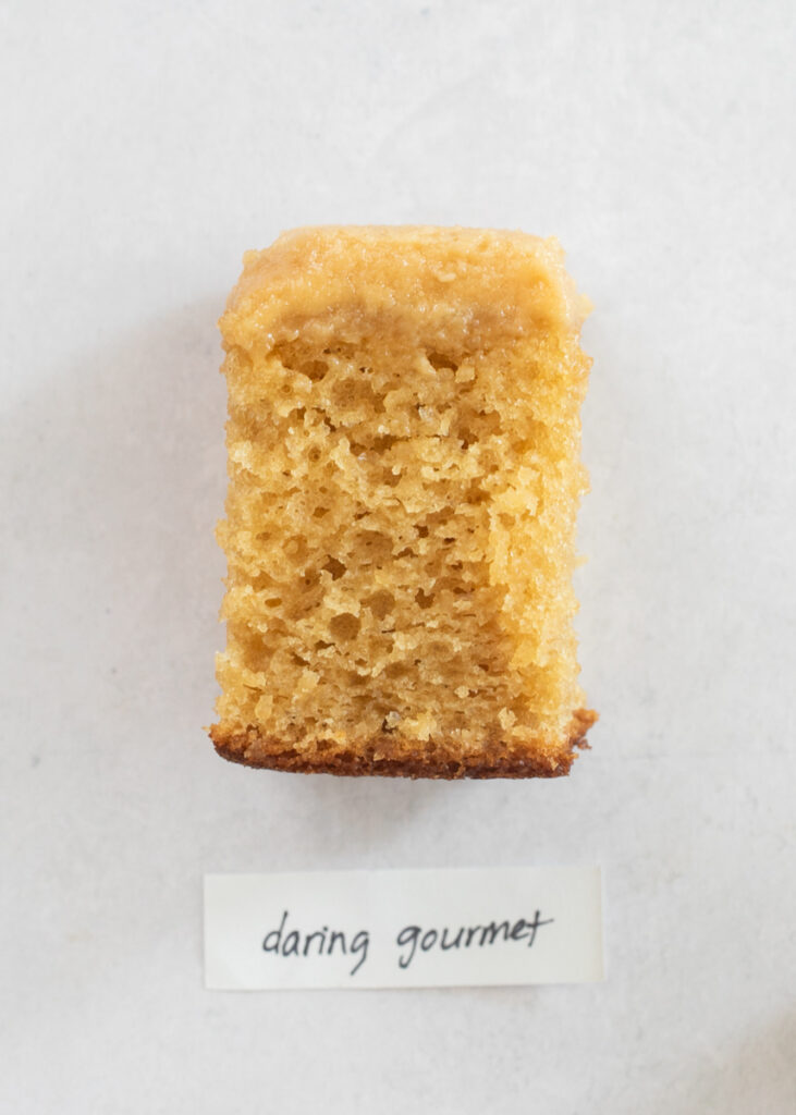 Even with half the amount of fat, this cake was still shockingly moist. The melted butter technique leads to a slightly sticky, thicker, lightly spongy crumb with a nice density. It isn’t my ideal close and tender melt-in-your-mouth crumb that you get from creamed butter batters, but it’s a fun and easy cake. Even though this cake is quite similar to Molly Yeh’s, I think the small tweaks really made a difference in the flavor and texture–I preferred the lift and flavor of Molly’s cake (this cake felt like it was missing salt in comparison).