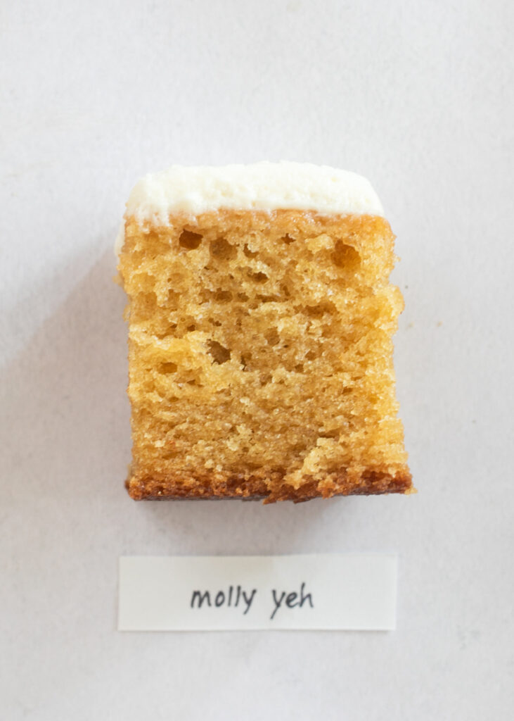 Molly Yeh: a plush and moist cake with a relatively thick crumb and sweet, nutty flavor