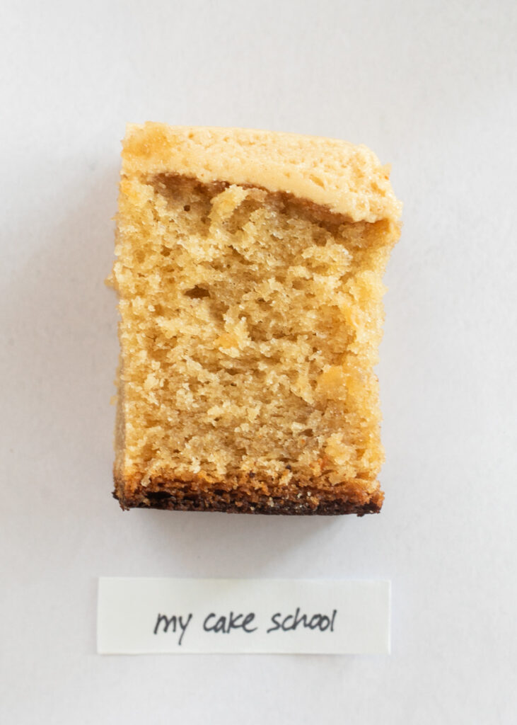 Buttermilk by Sam was my wild card recipe–this was the only recipe I tested that used brown butter in both the cake and frosting. This was the only recipe that called for cake flour besides My Cake School, along with a mix of butter and oil, buttermilk, processed peanut butter and granulated sugar. The frosting uses a mix of browned and regular butter, organic powdered sugar (Sam says organic powdered sugar is ideal because its made with tapioca starch instead of cornstarch, which melts on your tongue at a much lower temperature compared to cornstarch), peanut butter and a splash of cream.