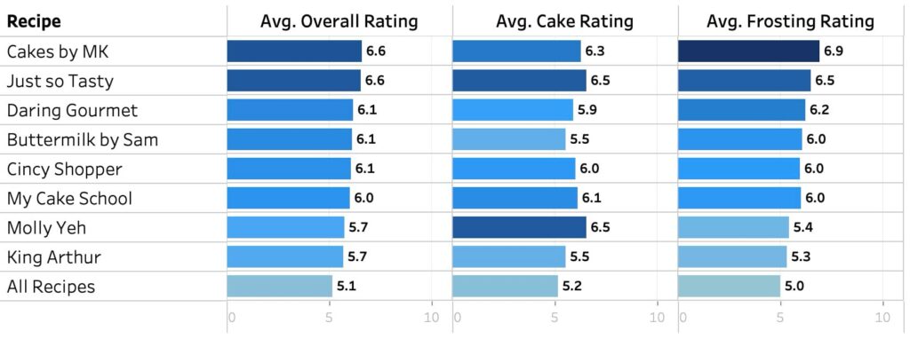 - Each taster rated each cake on a scale from 0-10 for flavor, texture and overall as a whole (see Results section below for the overall ratings)